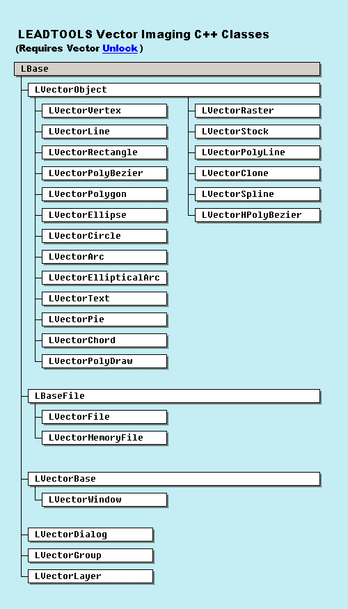 Below is a chart that outlines the derivation of the LEADTOOLS Vector classes. For information on the LBase and LBaseFile classes, refer to: