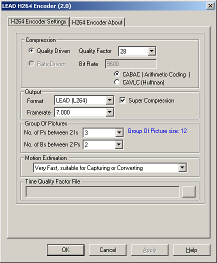 A real capture device (USB camera, TV tuner, etc): select the LEAD H.264 Encoder and set it up as shown in the following figure: