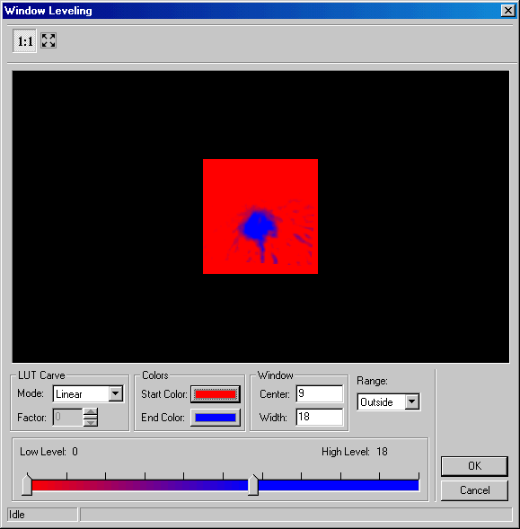 For example, suppose you are working with a 12 bit grayscale image. There are 4096 intensity levels in a 12 bit image (2 raised to the 12th power). Normally, the interval between 0 and 4095 would be mapped to colors between (0, 0, 0) and (255, 255, 255). With this function, any value that falls between the low level and the high level will be mapped to colors between the start color and the end color. If you do not want a gradient, set the start and end colors equal.