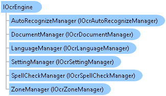 Once an instance is obtained, use the members of the IOcrEngine to perform various OCR tasks. OCR functions are grouped into "managers". Through these managers, you can create OCR documents (and add pages to these documents), perform zoning, recognition and saving the result documents. These managers are standard .NET interfaces with the implementation hidden inside the corresponding engine assembly. The following table lists the various "managers" and their main functionality: