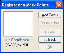 Click the Add Point button, and select three registration marks on the image by clicking on them. When you click on a point, its coordinates will appear in the list, and the Search Rgn button becomes available. You can delete a point by selecting its coordinates in the list and then clicking the Delete button.