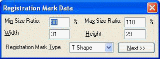 Currently there is one Registration mark type available, the T Shape. Enter the smallest size you think the registration mark could be reduced to, in percent, in the "Min size ratio" text edit box. Enter the largest size you think the registration mark could be zoomed to, in percent, in the "Max size ratio" text edit box. Enter the width of the registration mark, in pixels, in the "Width" text edit box. Enter the height of the registration mark, in pixels, in the "Height" text edit box. Click the Next button. The Registration Marks dialog will appear, as shown in the following figure: