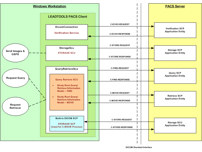 The following diagram shows how the Leadtools.Dicom.Scu interacts with a PACS server: