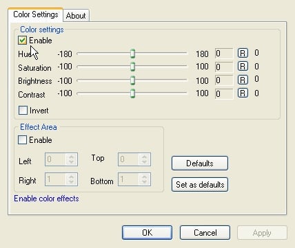 The Color Video filter changes the video's brightness, contrast, hue, and saturation. These changes can be applied to a selected area (rectangle) by changing the "Effect Area" attributes in the property page. The property page is shown in the figure below: