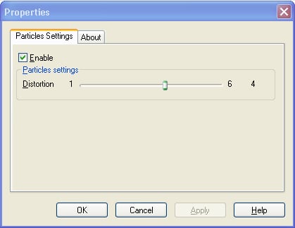 The Particles Video filter breaks a moving object into small particles, and then joins the particles to reform the object when it stops moving. The property page is shown in the figure below: