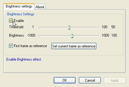 The Brightness filter 'hides' moving objects. In places where there is movement, the brightness of the background changes allowing you to see that there is movement, but you can only guess what it is by the shape. The property page is shown in the figure below: