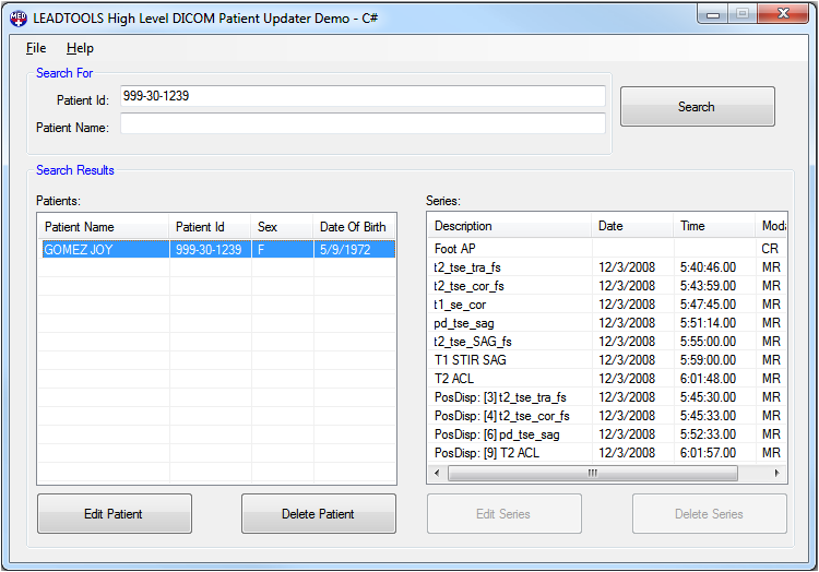 Select the correct patient record from the Patients list view on the left side of the LEADTOOLS Patient Updater dialog. A list view displaying that patient's individual series appears on the right side of the dialog.