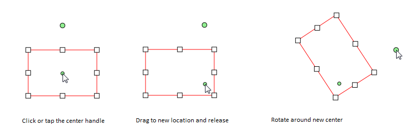 Annotation objects can be rotated using the rotation handles displayed on a selected object. One of the handles is the "gripper" handle, which rotates the object when dragged. The other handle is the "center" handle, which determines the center of rotation. The center of rotation can be moved by dragging. The gripper handle can be moved anywhere by dragging.