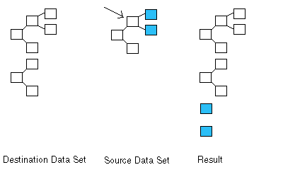 If both pSrcParent and pDstParent are NULL, the source data set will be inserted at the root level of the destination data set. Therefore the highest level elements of the source data set will be added as siblings to the highest level elements of the destination data set. This can be seen in the diagram below.