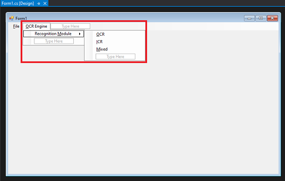 In the Solution Explorer, open Form1.cs. Add a new drop-down menu titled &OCR Engine. Add a new menu item to the drop-down menu titled Recognition &Module. Then, add three items to the Recognition Module item, titled &OCR, &ICR, and &Mixed, respectively.