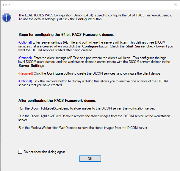 Review the settings listed under DICOM Servers Settings and DICOM Client Settings. When the settings are configured as desired, click the Configure button to create the DICOM services and configure the client demos.