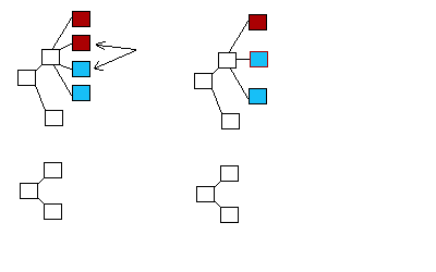 If an inserted element has the same tag value as a destination element at the same level and with the same parent, then the value from the source element is copied into the destination element and any child elements are added accordingly. For example, the diagram below shows the result of a call to Copy. If the two elements indicated by the arrows have the same tag value, the value from the source element is copied into the destination element and the structure on the right results. This is shown by the red outline of the destination element with the blue center of the source element.