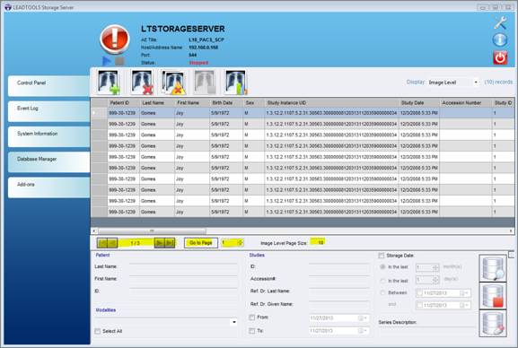 As an example, suppose your database has a total number of 25 instances, and you set the Image Level Page Size to 10 and then click the Search button on the Database Manager. The search will produce three pages of records. The first and second pages each display ten records, and the last page displays five records. Click the arrows or the Go to Page button to navigate between pages.