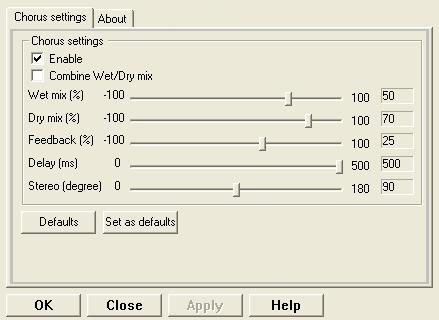 The Chorus filter creates several layers of the same sound, adding depth and resonance. The property page is shown in the figure below: