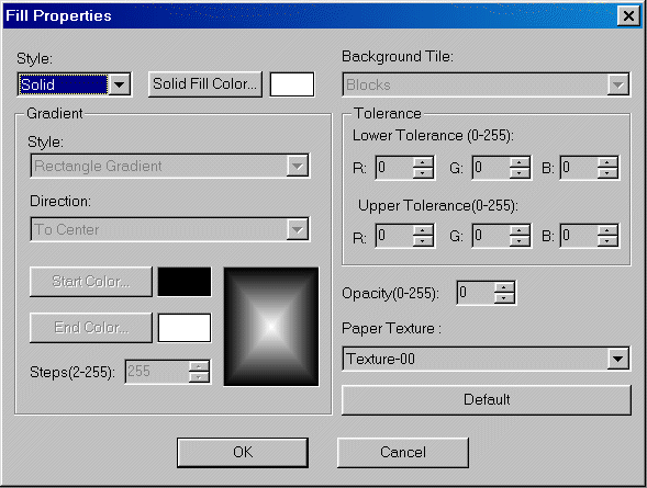 typedef struct _PAINTDLGFILLINFO{L_INT nSize;L_INT32 dwFlags;L_TCHAR * pszTitle;PAINTFILLSTYLE nStyle;COLORREF crSolidFillColor;L_TCHAR ** ppszBackgroundTileBitmap;L_UINT uBackgroundTileBitmapCount;L_INT nActiveBackgroundTileBitmapItem;PAINTFILLGRADIENTSTYLE nGradientStyle;COLORREF crGradientStartColor;COLORREF crGradientEndColor;L_UINT uGradientSteps;COLORREF crUpperTolerance;COLORREF crLowerTolerance;L_INT nOpacity;L_TCHAR ** ppszPaperTexture;L_UINT uPaperTextureCount;L_INT nActivePaperTextureItem;} PAINTDLGFILLINFO, *pPAINTDLGFILLINFO ;