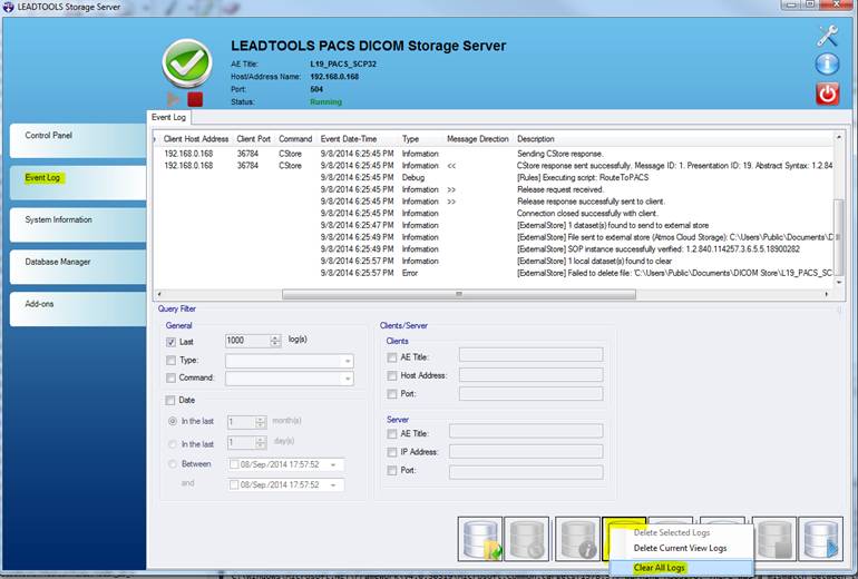 Click the Event Log tab, click the Delete Selected, and choose the Clear All Logs from the popup menu