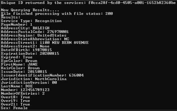 This sends an ExtractAAMVAID request to the LEADTOOLS Cloud Services API, if successful, a unique identifier (GUID) will be returned and then a query using this GUID will be made.