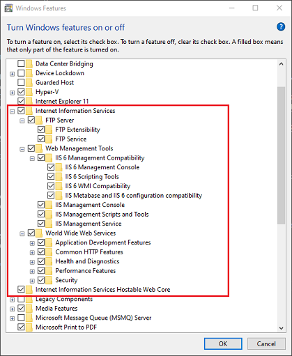 Open the Windows Start menu and start typing "Turn Windows features on or off". Open the Windows Features dialog box and make the following selections (both a listing of the selections and screenshots of the selections within the dialog box are provided below):