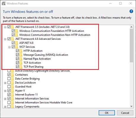 For Windows 8 or newer the following features are required: .NET Framework Advanced Services