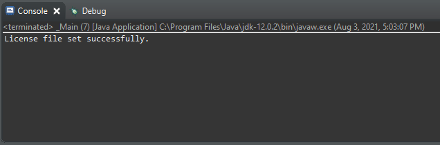 If the steps were followed correctly, a message in the Console window will show License file set successfully.