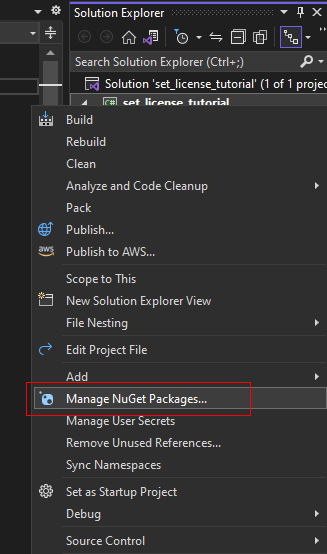 Right-click on the C# project in the Solution Explorer and select Manage NuGet Packages....